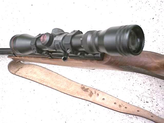 So I decided to try and simplify things, I figured that fitting a tube to the side of the scope body would enable me to slide pellets head first down the tube into the loading channel. I got some aluminium tube with a 6mm internal diameter and cut a short length, by trial and error I soon found that roughly a 45 degree angle was sufficient to send the pellet into the loading channel just in front of the probe. A piece of the tube was cut in half to cover the loading channel and the tubing lined up to one side of the scope body and the two were married together and a hole bored through and corners smoothed off etc. A bit of work with the sewing kit, some leather and velcro and I had the tube fixed to the side of the scope body. I sprayed it all black so it would not stand out in its natural colour. |